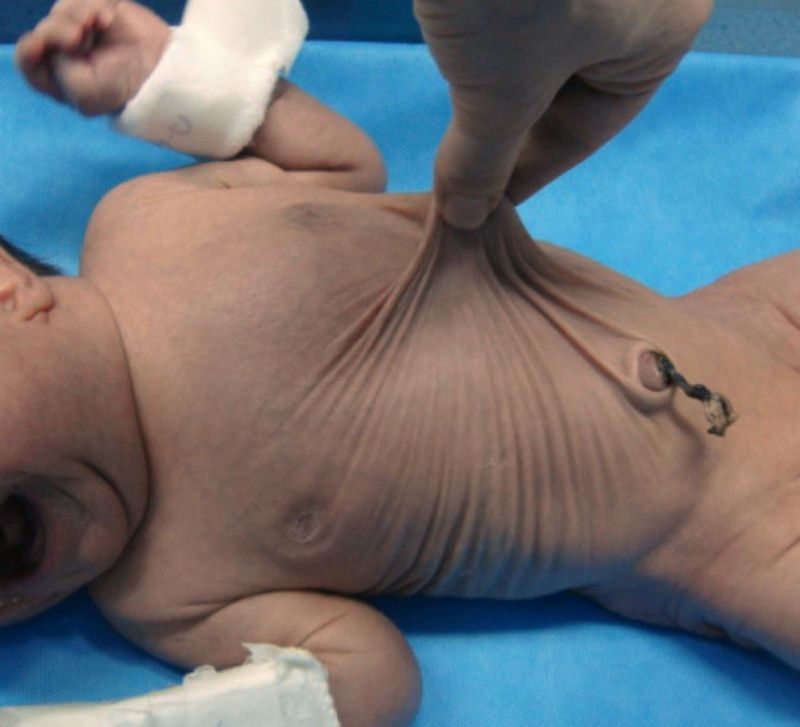 - Elastic, wrinkled skin: The skin may appear baggy or loose and may have an aged, “shrunken” look. This is most noticeable on the face, arms, and legs.