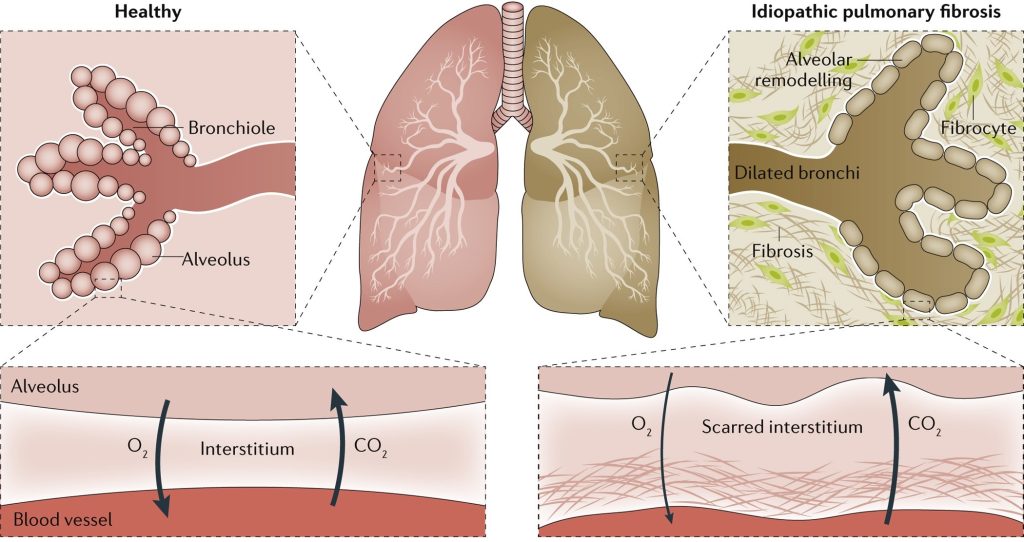 Idiopathic Pulmonary Fibrosis (IPF) is a chronic and progressive lung disease that causes scarring (fibrosis) of the lung tissue. “Idiopathic” means the cause is unknown, and “pulmonary fibrosis” refers to scarring in the lungs. Over time, this scarring makes it increasingly difficult to breathe and for oxygen to pass into the bloodstream.